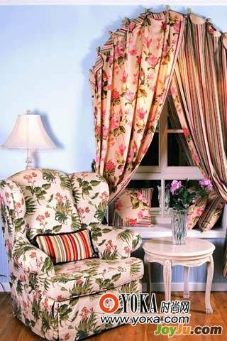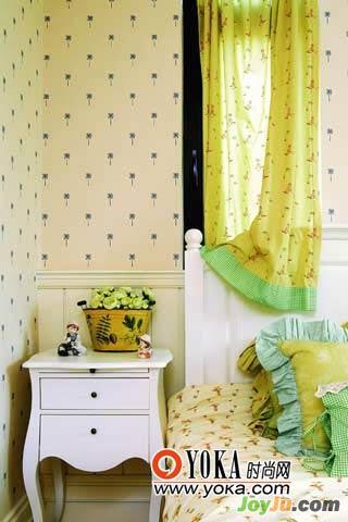 5.設(shè)計(jì)窗簾時(shí)要注意因勢(shì)利導(dǎo)、因人而異,根據(jù)窗戶(hù)的特點(diǎn)和使用者的性格特征來(lái)設(shè)計(jì)。此間兒童房的窗簾采用分體式設(shè)計(jì)。上半部圓弧形部分是用棉布做出自然褶度的異型窗簾,以魔術(shù)貼固定在窗框上,拆卸清洗均十分方便;下半部則是用彩色條紋棉布制成的卷簾,在卷簾下部開(kāi)了個(gè)高叉,兩邊則配以紐扣和紐孔。這樣,即使卷簾放下的時(shí)候,也能很方便地把卷簾一角掀開(kāi),以紐扣在相應(yīng)部分固定好,以獲取光線(xiàn),符合兒童的需要。