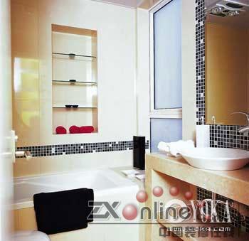 空間不大,也許可以說有點兒局促。但即使在這么個小小的角落,衛(wèi)浴的主人都沒忘了給環(huán)境打上“格子”。在柔和的主色調(diào)中,粗獷的藍色瓷磚勾勒出幾道輪廓,整個空間立刻顯得整齊了很多。另外,黑色的浴巾和紅色的毛巾球在背景色中非常醒目,給人眼前一亮的感覺。衛(wèi)浴的主人不是一個可以忍受平庸的人,他喜歡通過小心思來創(chuàng)造生活的亮點。不要以為這種亮點僅限于視覺上的小小刺激,在索然無味的生活中,他會時不時創(chuàng)造些小驚喜。