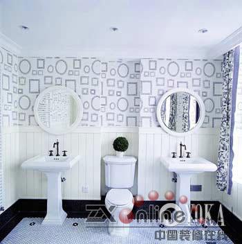 那是個抽水馬桶嗎?它難道不更像一個寶座嗎?不但馬桶本身居于嚴格對稱的布局正中,就連唯一的植物都在強調(diào)著這個抽水馬桶的不可一世。看上去,這個衛(wèi)浴間更像是以這個馬桶為中心設(shè)計的。在馬桶周圍不僅強調(diào)格局的對稱,而且到處都是圓形和方塊。這兩種圖案鋪滿了墻壁,就連鏡子和盥洗池都是。再加上整齊排列的頂燈和墻圍上的大量的直線條,這個衛(wèi)浴間的主人是個有點自我中心的人,他重視自己的地位和權(quán)威,嚴謹而不散漫。