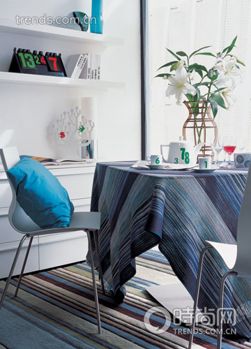 這間以海藍(lán)色精心渲染的餐廳依然延續(xù)簡潔明亮的風(fēng)格,除了地板鋪上了藍(lán)紫色系的條紋地毯,還有與之花色近似的桌布之外,你幾乎找不出太多喧鬧的元素。與綠色植物一同置于餐桌上的還有點(diǎn)綴了嫩綠色數(shù)字圖案的純白色茶具,茶壺茶杯詼諧有趣。翻牌臺(tái)歷的黑色底面上顯示著紅綠兩色的數(shù)字,顯示時(shí)間的同時(shí),更增加了色彩對(duì)比的層次感。