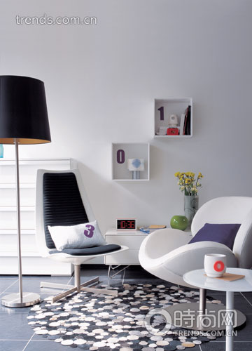 別以為數(shù)字只能現(xiàn)身于鐘表的表盤上,眼前的這間客廳以素雅干凈的黑白兩色為基調(diào),單人沙發(fā)椅的流線設(shè)計(jì),墻面錯(cuò)落懸掛的立體收納柜,簡潔硬朗的落地?zé)舸钆溆蔁o數(shù)小圓片構(gòu)成的圓形地毯,似乎一切都沒什么問題,但又覺得少了些什么。幸好那些紫色與橘色的數(shù)字裝飾點(diǎn)綴其間,如同畫龍點(diǎn)睛之筆,使整間客廳的表情立刻生動(dòng)起來。