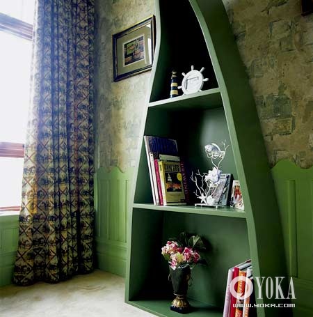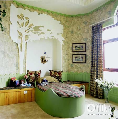 3 綠色的小床為特別訂制,獨特的船形能夠和背景墻很好的契合,同樣的木質材料又如同是樹的延伸,從而成為房間的主體部分,營造出森林中的氛圍。