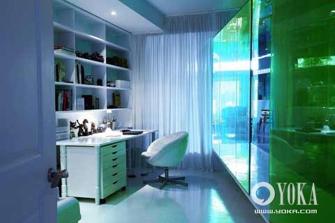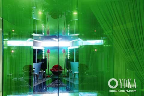 這種帶著跳躍性思維的布局方式在客人進(jìn)門的第一眼就帶來了新奇,然而,真正使人感到有冷酷仙境之美的,是貫穿在房間中的那個綠色有機玻璃的走廊。它帶來了強烈的視覺效果,不禁使人對通道里隱隱約約的艷麗世界充滿好奇。