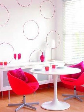 以亮白色為底色,在墻面上涂裝紅色的圓圈圖案,這種主題墻的效果引人注目。像是一匹放大的椅子包面,產(chǎn)生出奇妙的視覺幻象,適用于裝飾起居室,同時也適用于臥室。為了增加趣味性,嘗試用時髦獨特的紅色油漆裝點房間的踢腳板,標(biāo)新立異。
