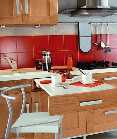 由于家具設(shè)施在任何生活行為空間里所占的比例都比較大,家具的色彩往往會(huì)左右環(huán)境的色彩。 因此,對(duì)廚房家具色彩的要求是能夠表現(xiàn)出干凈,使人愉悅的特征。廚房家具的顏色通常中性色較少,而明度較高的色彩如白、乳白、淡黃等所占比例較大,能夠刺激食欲的色彩,如橙紅、橙黃、棕褐等跳躍顏色起搭配作用。