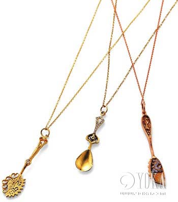 17世紀歐洲貴婦吃冰淇淋用的勺子和18世紀王公貴族喝湯用的湯勺都成了項墜,這個創(chuàng)意來自Demitasse珠寶首飾公司。該公司原來還計劃推出餐叉和餐刀系列項墜,但考慮到安全和宗教因素,還是最終放棄了。 左起:約¥5000/件 ¥6500/件 ¥8000/件