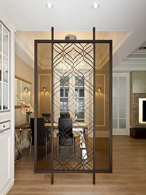 從這個面看餐廳有點兒若隱若現(xiàn),這要歸功于這一款鐵藝的玻璃屏風(fēng)了。玄關(guān)處與餐廳間擺放這樣一個做工精美的陋斷,既不影響空間又能做到拉高層次,壁面則以仿布板壁紙和畫框境搭配,華麗的吊燈反射出放大空間的效果。