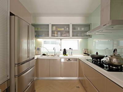 "ㄇ"型的廚房強化收納功能及使用動線,選用了方便清理的仿木紋地磚,搭配溫暖色系廚具。這個廚房的主婦很具巧手。