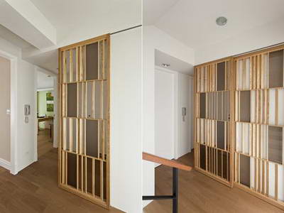 樓梯間以兩片木作移動式屏風(fēng)巧妙遮擋了廁所門,木制的線條有特殊的景致。既增加了空間美感,又讓整體設(shè)計更上一個層次。