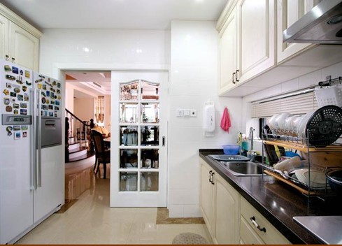 ②嵌在櫥柜中的電器設(shè)備?,F(xiàn)在廚房面積大小比較適中,電器隨之帶進(jìn)了廚房??筛鶕?jù)個人不同需要,把冰箱、烤箱、微波爐,洗碗機(jī)等布置在櫥柜中的適當(dāng)位置,方便開啟、使用。