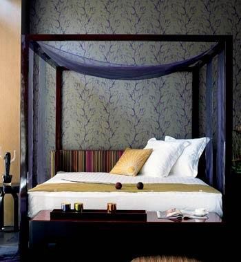 臥室中色調(diào)柔和的布藝床頭莊重典雅而不乏輕松浪漫的感覺,與灰紫色暗花紋壁紙和深紫色的格紋地毯相互呼應(yīng),多層次的色彩變化,中和了深色家具帶來的冷靜,帶有灰度的柔和色調(diào)讓整個(gè)房間停留在雅致迷人的氛圍里。