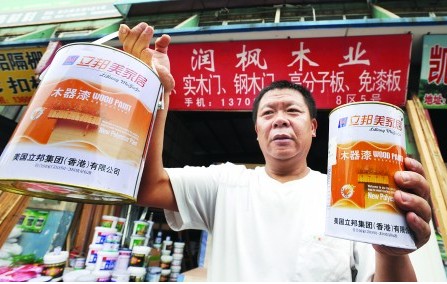 為給兩套新房裝修,經(jīng)熟人介紹,閆繼民認(rèn)識(shí)了包工頭楊某。5月28日,在楊某的介紹下,閆繼民來(lái)到新白鶴裝飾材料市場(chǎng)魏某的店鋪里購(gòu)買(mǎi)裝飾材料。由于對(duì)裝修材料一竅不通,也是出于對(duì)楊某的信任,閆繼民按照包工頭開(kāi)出的材料單一口氣買(mǎi)了12881元的裝修材料。其中就包含8組“立邦美家居”的木器漆,每組價(jià)格300元。在木器漆的外包裝上注明“美國(guó)立邦集團(tuán)(香港)有限公司”。