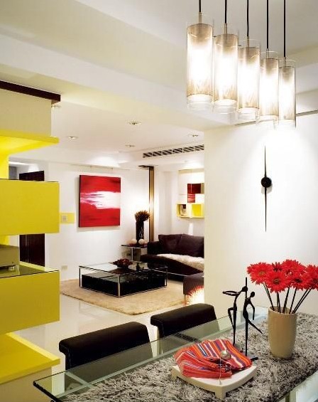 此案例大膽的運用了跳色進(jìn)行設(shè)計,搶眼的黃、紅,分散在黑白對比的空間中,黑色的紫壇木線條,從臥室的入口門框出發(fā),一路將電視墻面框架起來,折出一個展示區(qū)塊,上下都是收納柜,展現(xiàn)強大的隱藏收納功能,并運用隱藏式燈光,減輕其厚重感。