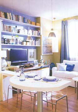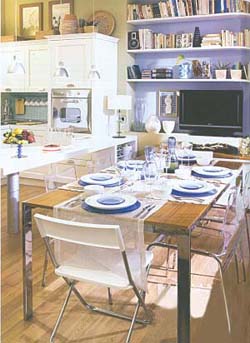 在這35平方米空間里可說是五臟俱全。一張餐桌、六把餐椅,占據了客廳的所有活動空間,但有了可伸縮的餐桌,在不聚餐的時候,客廳里的活動空間可被完整地還原。金屬結構、橡木臺面的餐桌搭配半透明水晶外殼的椅子,布置出簡潔的就餐領地。準備若干把可折疊的椅子是必要,方便就餐客人人數的增減。白色的桌布、藍白兩色的餐具干凈清爽??臻g雖小,與朋友相聚的快樂卻一點都不會減少。