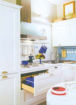 白漆櫥柜令小廚房充滿了明亮印象,人造石臺面與櫥柜渾然一體,品質感絲毫不減。在與壁柜相接的空白墻面上,天藍色玻璃馬賽克令流動的視覺產生出美妙的變化。所有的餐廚用具都以藍色、白色和金屬色為主,統(tǒng)一的色彩使小廚房里沒有任何的雜亂。