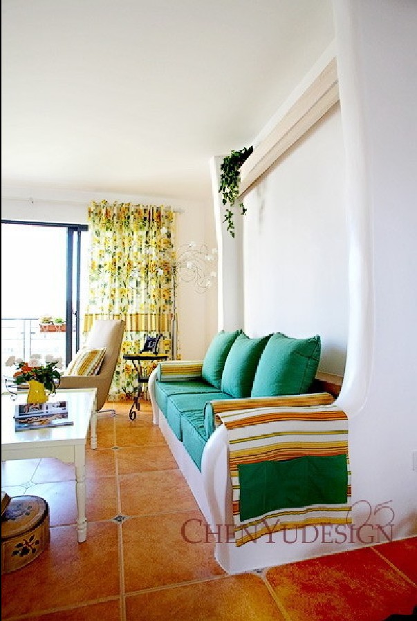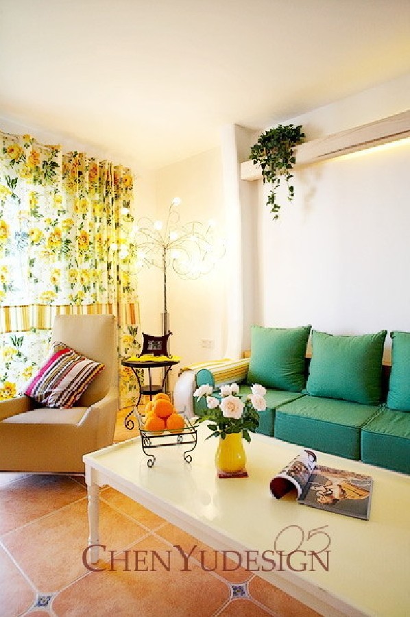 這套婚房的特點(diǎn)是在于他們的主人很年輕,帶給我們不一樣設(shè)計(jì)感覺(jué)。讓設(shè)計(jì)師有了突飛的思維,也讓這個(gè)房子更加的出彩。上圖為客廳的一角,設(shè)計(jì)風(fēng)格以簡(jiǎn)約、歐式混搭,線條很簡(jiǎn)約,色彩很艷麗。黃色的碎花窗簾布藝,白色的沙發(fā),綠色的沙發(fā)墊,加上黃條紋,地上的方片瓷磚易打理,這也是8090后的一大生活特點(diǎn)了。