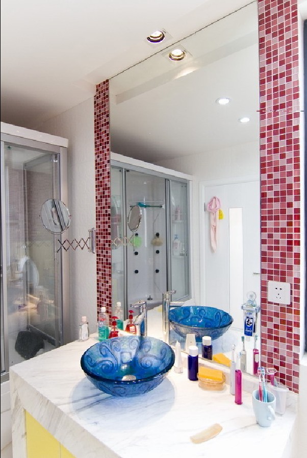 洗漱臺(tái)上,花色的馬賽克拼貼,即使是白色的臺(tái)面也沒(méi)有枯燥的感覺(jué)。