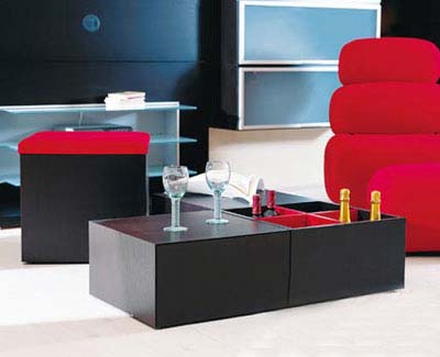 這套組合茶幾共由四部分組成,帶紅色布藝面的可以當(dāng)坐位;里面有紅色隔斷的是酒架;另外兩個(gè)封閉式設(shè)計(jì)帶有手動(dòng)按鎖,里面可以儲(chǔ)放客廳里的零碎物品。