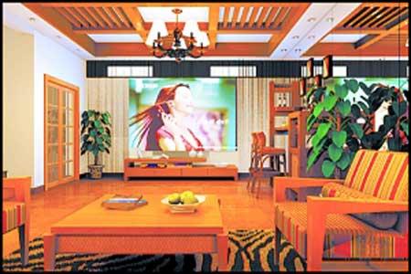 客廳與休閑室之間的墻中間被掏了一個方形洞,洞四周用木框包邊,做成窗戶的樣子。而客廳的電視機就放在窗戶上,給人的感覺是一面電視墻。在這個大窗框后面就是休閑室的墻,建議墻上用大幅山水畫或油畫,在室內營造一幅藝術美景。裝飾裝修