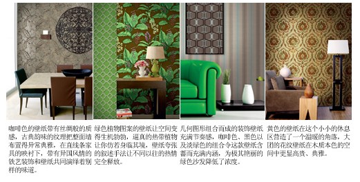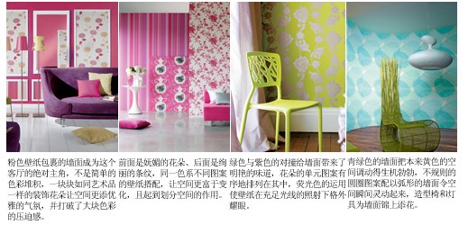 整體效果:壁紙的色彩十分廣泛,不同材質的壁紙可以產生不同的色彩氛圍和質感,紙基壁紙和PVC壁紙比較普遍,色彩眾多,容易清潔;而織物壁紙和植物壁紙在立體感的塑造上比紙基壁紙要略勝一籌,但是清潔起來比較麻煩,凹凸紋理的細節(jié)需要在保養(yǎng)上下一番工夫;其它的壁紙,如金屬壁紙、熒光壁紙可以產生一些特殊的效果來裝點房間。和絢麗色彩相映成趣的當然是壁紙上的圖案,最常見的使用方法是在整體氛圍確定后,以局部點綴一些帶有花紋的裝飾圖案,把人的視覺重點自然地過渡到帶有圖案的墻面上,令鮮亮的色彩和各種圖案完美地融合在一起。