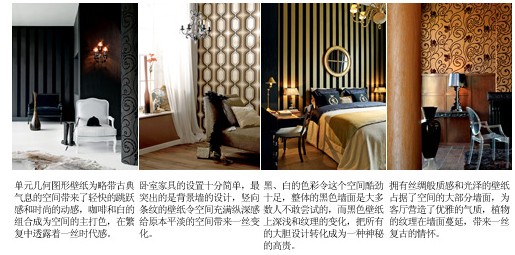 整體效果:異域元素的壁紙在色彩上十分低調,通常最突出的表現是壁紙上帶有異國特色的紋理裝飾,不同的花紋能帶來不同國度的韻味,不同的植物更有不同地方區(qū)域的特點,用深色或者單一色彩打底才能凸現這些花紋帶來的異域風情,異域元素的出現可以恰到好處地安撫普通空間的過于平淡,也可以彰顯個性空間的獨特審美,為空間蓋上時尚的印章。與異域元素搭配的家具大多線條簡潔,在質感和細節(jié)的設計上卻有過人之處,精致和細膩的家具是異域風情最好的詮釋。
