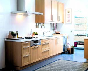 單排式廚房就是將所有的電器和櫥柜都沿著一面墻壁放置。也就是說(shuō),將工作三區(qū)域安排在一條直線上進(jìn)行。這種緊湊、有效的窄廚房設(shè)計(jì)非常適合中小家庭或者同一時(shí)間只有一個(gè)人在廚房工作的住房。如果在大廚房運(yùn)用這種設(shè)計(jì),就可能造成不同功能之間的距離太大。