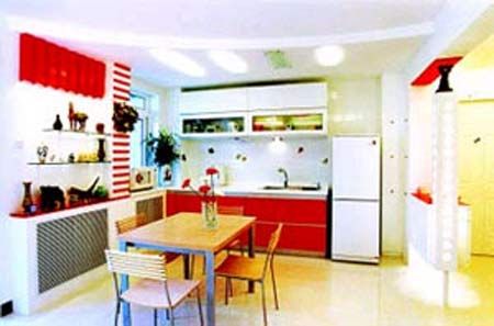 簡單的吊頂在空中劃出優(yōu)雅的弧線,把偌大的空間劃分出層次。鮮艷的紅白兩色在所到之處以不同的方式自由調(diào)和,無論是左側(cè)墻面上的精巧的展示柜,還是原木色的簡單桌椅,亦或是右側(cè)造型獨(dú)特的燈柱狀玄關(guān),徹底驅(qū)逐了傳統(tǒng)廚房的沉悶,處處洋溢著耀眼的光芒和躍動的色彩……