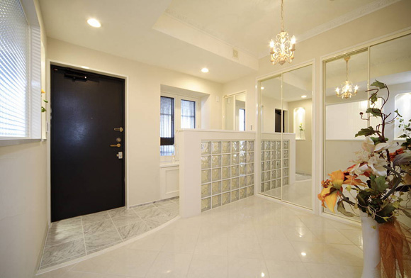 為了讓玄關看起來更寬敞,所以收納柜全是采用鏡面材料。鏡子也可把視覺空間感增大。整個玄關處寬敞、明亮。