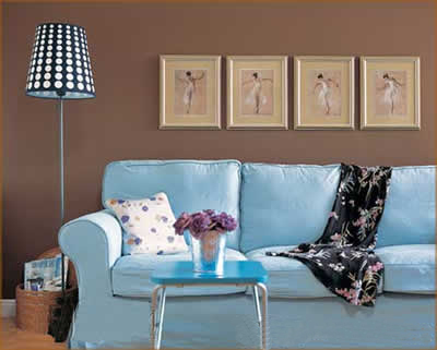 概要: 深棕色的墻前邊一擺上這淺藍(lán)色沙發(fā),房間變得韻味十足:明是明,暗是暗,統(tǒng)統(tǒng)都從容。再把靠墊套也換成淺色碎花圖案的?! ∷{(lán)色,今年夏天特別流行的松石藍(lán)色或者海藍(lán)色、天藍(lán)色,都與棕色十分相配,能讓有大面積棕色的暗調(diào)居室一下子變明亮起來(lái)。不過(guò)藏藍(lán)色是忌諱的。上海裝潢網(wǎng) 臥室墻壁刷了豆綠色,再將床上用品換成白色的,就已經(jīng)很寧?kù)o了。