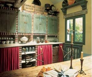 有效收納,只能算作是對廚房功能上的考慮。廚房和居室中其它區(qū)域一樣,還要有視覺的呈現(xiàn),這才能真正體現(xiàn)出設(shè)計的匠心所在??催@一處廚房,不難感受到它的歐陸鄉(xiāng)村風(fēng)格,這緣于它大面積原木的使用。粗礫的面板帶出原始的情懷,而吊柜與壁櫥的紅磚框架與白灰嵌線,表現(xiàn)出當(dāng)下十分流行的懷舊風(fēng)。另外我們可以注意到,這一間廚房特別講究視覺的完整性與開闊性,而這一特色的實現(xiàn)來自于吊柜的整齊柜門與壁櫥的紅色掛簾,將它們關(guān)閉或者掛上,呈現(xiàn)于你眼前則沒有了廚房通常難以回避的繁雜層次,而只是一副簡潔的歐陸風(fēng)情畫。柜門的綠與掛簾的紅成了整體視覺設(shè)計上的點睛之筆,不僅讓這種復(fù)古的情調(diào)更加濃郁,而且還平添了幾分殷實之氣。