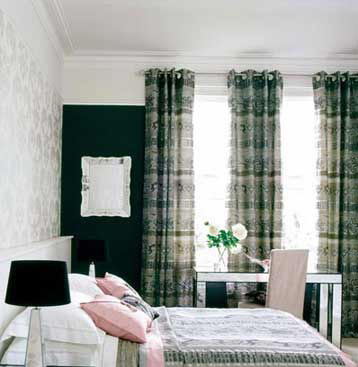 概要: 灰黑色條紋窗簾搭配凹凸紋理的黑色壁紙,層次分明。鏡面家具、裝飾品讓黑色墻面有了一些通透感。簡約而略帶復古圖案的布藝壁紙演繹著上世紀的優(yōu)雅品位,繁華而不失現代格調?! 』孟敫鞣N溫馨的場景,用小比例花草圖案點綴的淡雅布藝、壁紙裝扮臥室,就能讓心緒牽引出無限遐想。讓臥室徹底擺脫蒼白的簡約主義面容,需要從整體到細節(jié)完整考慮。