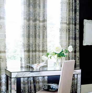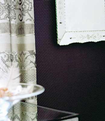 灰黑色條紋窗簾搭配凹凸紋理的黑色壁紙,層次分明。鏡面家具、裝飾品讓黑色墻面有了一些通透感。簡約而略帶復古圖案的布藝壁紙演繹著上世紀的優(yōu)雅品位,繁華而不失現代格調。