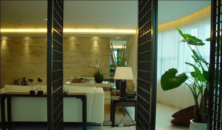 沙發(fā)背后的鏤空的隔斷相連的是兩個臥室,將休息與會客空間分隔的很清晰