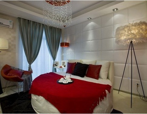 舒適的臥室,不同于客廳的是紅色地毯更換為神秘的黑色,浪漫室內(nèi)的一點(diǎn)穩(wěn)重、大氣展露無疑。艷紅色的靠枕、紅色皮質(zhì)座椅,羽毛臺(tái)燈都為臥室充滿了**、俏皮,溫馨感倍增。