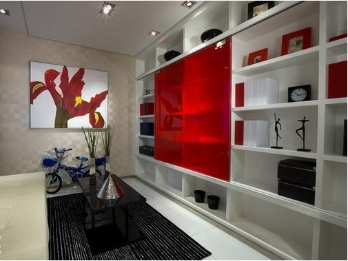 客廳、書房兩用。背景墻充分利用了墻體,增加收納、儲(chǔ)物功能。正面的墻壁都做了隔板、格架、書架之類的,整個(gè)色調(diào)也圍繞著紅白黑三大色塊為主。