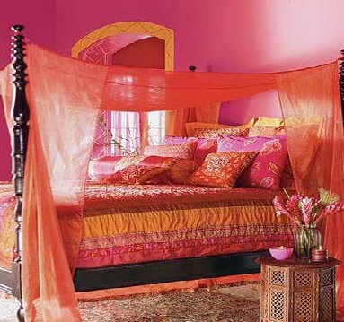 為了追求臥室空間的浪漫、溫馨,設(shè)計師選用溫和的粉紅色作為主調(diào),墻面、頂面、地板和諧搭配。由于陽臺的啞口過寬,空間交流太過充分,所以做了紅色方磚墻柱來分割空間,美化了居室。