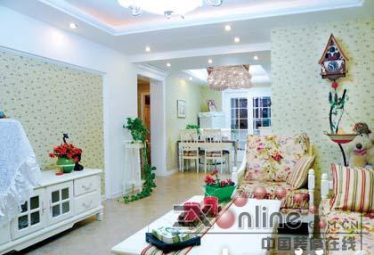 大面積地使用壁紙有一個問題,那就是很容易顯得雜亂或是沉悶。所以設(shè)計師特意設(shè)計了許多大面積的留白。例如,電視背景墻四周的白框。這棟房子的主人沒有把時下流行的等離子或是液晶電視掛在客廳墻上,非關(guān)經(jīng)濟(jì)因素,只是因?yàn)橹魅伺c設(shè)計師一致認(rèn)為,太具現(xiàn)代感的液晶電視與自然的歐式鄉(xiāng)村風(fēng)格太不搭調(diào)了。就這樣弄一臺老式顯像管電視擺在電視柜上,再在上面蓋上女主人精心挑選的白色電視布,很有一種歐洲文藝電影的味道。 上海裝潢網(wǎng)