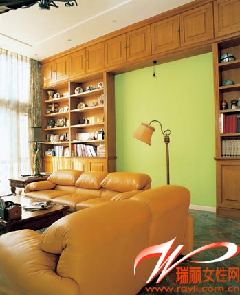 2 占據(jù)整面墻的落地柜是實木質地的,自然的木色、黃色的沙發(fā)與淡雅的青草綠色搭配在一起,顯得非常諧調(diào),在落地柜的中間預留了掛畫的位置,這里將成為以后客廳的視覺中心。 上海裝潢網(wǎng)