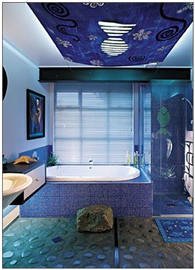許多人都以為鵝卵石只能鋪在地上,設(shè)計(jì)師卻一改思路,不僅僅在浴室的地上鋪滿了深淺不一的鵝卵石,連墻壁也鋪滿。為了與鵝卵石的顏色相配,水盆選擇了簡(jiǎn)單的黑白色。除了圓圓的梳妝鏡旁擺放一瓶小干花外,沒有花巧的裝飾。這種設(shè)計(jì)讓小小浴室的裝修風(fēng)格保持一致,人在里面,就好像置身于郊外,充滿了休閑自在的氣氛。也許設(shè)計(jì)師對(duì)這個(gè)設(shè)計(jì)很滿意,所以浴室采用透明的玻璃門,讓每一個(gè)客人都欣賞到這一有趣而大膽的設(shè)計(jì)。