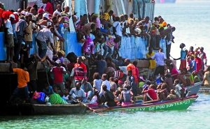 1月20日,災(zāi)民們在太子港一個港口登船準(zhǔn)備離開。