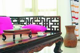 他說:“雖然曾多次搬遷,但所向往及鐘愛的家居風(fēng)格卻始終如一,即是簡潔底色加上古新雜糅的家具搭配,最合我心意?!睂λ?,“家”最重要就是舒適美觀,能夠把自己大量的收藏得體地展示出來。只要懂得布置的手法與竅門,縱使再普通的房子也一樣能令人眼前一亮。所以,家里的裝修不多,白墻、極大塊淺白色的仿石材地磚,簡單大氣。摒棄了繁華夸張的布置,家中的視覺焦點(diǎn)自然而然地落在一室古舊的家具以及風(fēng)格特異的掛畫上。古今融合的客廳,以木色和淡米色為主,一幅幅碩大的畫像襯托在素雅的客廳下,無疑成了廳中的一大特色。放眼望去,客廳中央的淡灰色布沙發(fā),似乎是廳中唯一的新潮家具。相對之下,周遭精致且玩味的收藏品卻布滿了整屋子,文化的味道就這樣淡淡發(fā)散,耐人尋味。