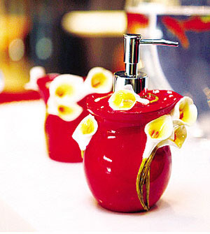 制造陶瓷一向是中國(guó)人的拿手技術(shù),這個(gè)乳液瓶和牙刷架采用了整體燒制的手法,花朵造型逼真,再搭配接近透明的材質(zhì),賦予衛(wèi)浴一種別樣的美感。需要注意的是,陶瓷類產(chǎn)品屬于易碎品,在使用時(shí)要非常小心,防止割傷或劃傷皮膚。