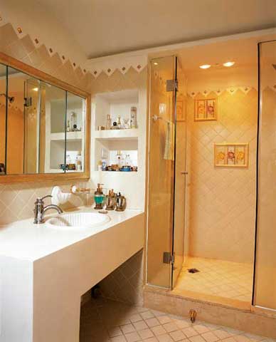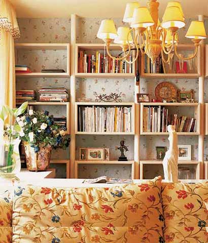 最值得玩味的是,各種花朵元素被精心安排在各處,巧妙地呼應(yīng)著居室的主題。同樣的藍(lán)色壁紙上對(duì)比運(yùn)用了田園風(fēng)格的枝葉繁茂的大團(tuán)花與清新簡(jiǎn)潔的小碎花;白色的書(shū)柜特意選擇了無(wú)背板的設(shè)計(jì),可以透露出壁紙的花色,在細(xì)節(jié)的微小之處更體現(xiàn)了空間延伸的概念;鵝黃紗幔上的淡雅提花和白底沙發(fā)上的紅、藍(lán)花朵又與房間主色和諧一致;甚至在浴室的墻面和門(mén)上都不忘裝飾上花朵元素;更有花瓶中絢爛的藍(lán)、白花卉點(diǎn)綴其中,營(yíng)造出猶如夢(mèng)幻般的私家花園的居室,一切都令人感覺(jué)那么愜意、愉悅。